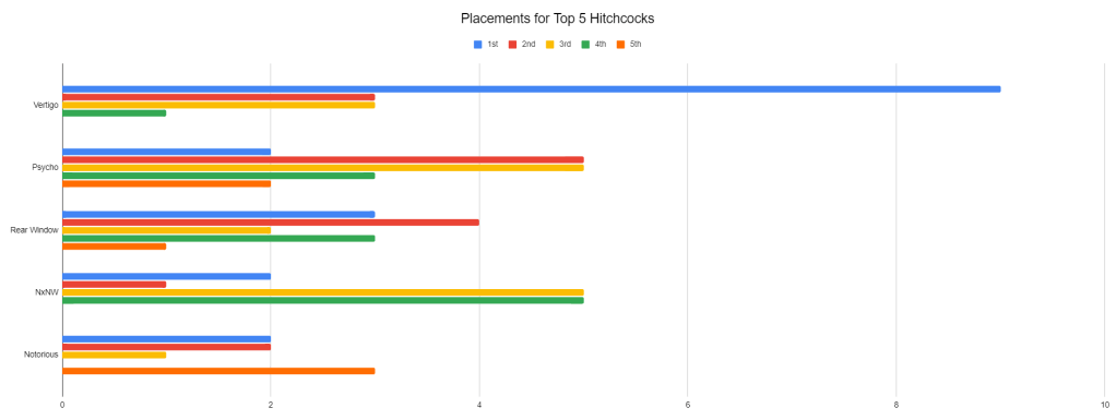 As far as this tier goes, it’s a fairly wide in terms of separation between the highest and lowest score; Notorious is 2.55 points distant from Vertigo, which is the biggest gap between top and bottom in a tier since Tier 4. Maybe Rebecca could have gone in here as well, but I decided against it. For one thing, it’s pretty far away from Notorious, which makes it untenably distant even from Psycho as far as the averages go. For another, I think this is a fairly pure top five. While you find some people going for Rebecca, Shadow of a Doubt, or Rope in their top five, these are emphatically the most frequent choices there.