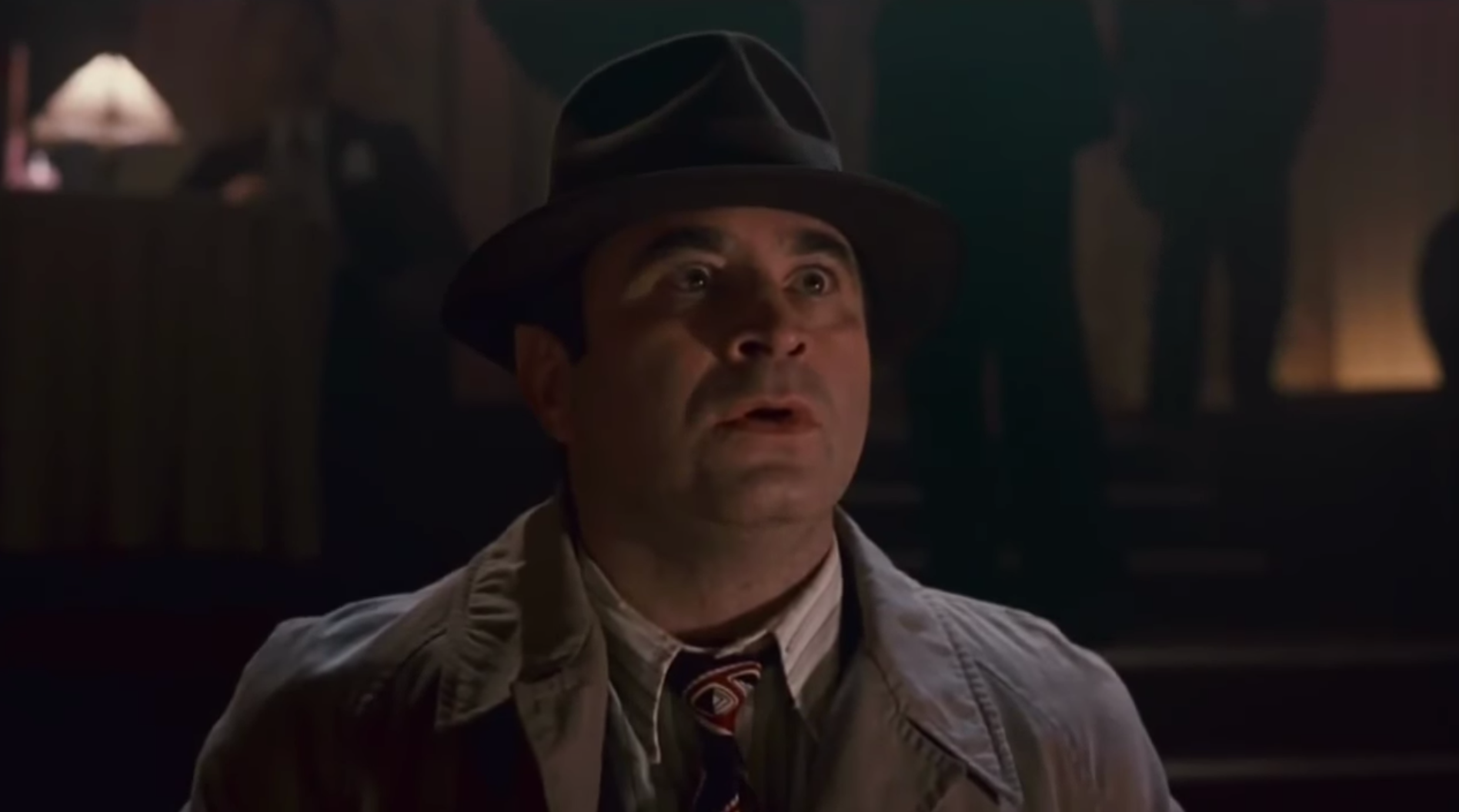 Speaking of misplaced sexual urges, here’s Bob Hoskins starring at a cartoon woman. Frankly this is kind of the point of Who Framed Roger Rabbit, a genuinely postmodern film made when Robert Zemeckis could still access his sense of humor. I saw a critic I really like refer to Ready Player One as a postmodern film on Twitter the other day and I about pooped my Lyotards; I suppose that there’s a case to be made that recklessly referencing other texts is postmodern in some sense, but whether or not it’s good or well-made seems like it ought to be part of the calculus here. Who Framed Roger Rabbit is living in a world where the fantasy of Bugs Bunny and Mickey Mouse and Betty Boop is a real one, one that’s palpable for regular people, and, well, isn’t it truly? Eddie Valiant is inured to toons, sick to death of them, and when Jessica Rabbit appears on stage, something a couple feet below his brain changes his mind for him. It is endlessly funny that “Jessica Rabbit” is a person, a married woman whose surname is “Rabbit,” because it so brilliantly confuses us after lifetimes of knowing that he’s Bugs Bunny and she’s Daisy Duck and so on. And so in that face that Eddie’s making, this look which says “Yowza!” in no uncertain terms, we’re having a very different reaction than the character on screen. Jessica is an unexpected cartoon, a figure we were not prepared for, bustier and slinkier than anyone who ever showed up on our TVs. But for Eddie, who has lived among the toons, this is a straight “Yowza!” It’s got nothing to do with her animated form, but it has everything to do, as Jessica puts it later, with how she’s drawn.