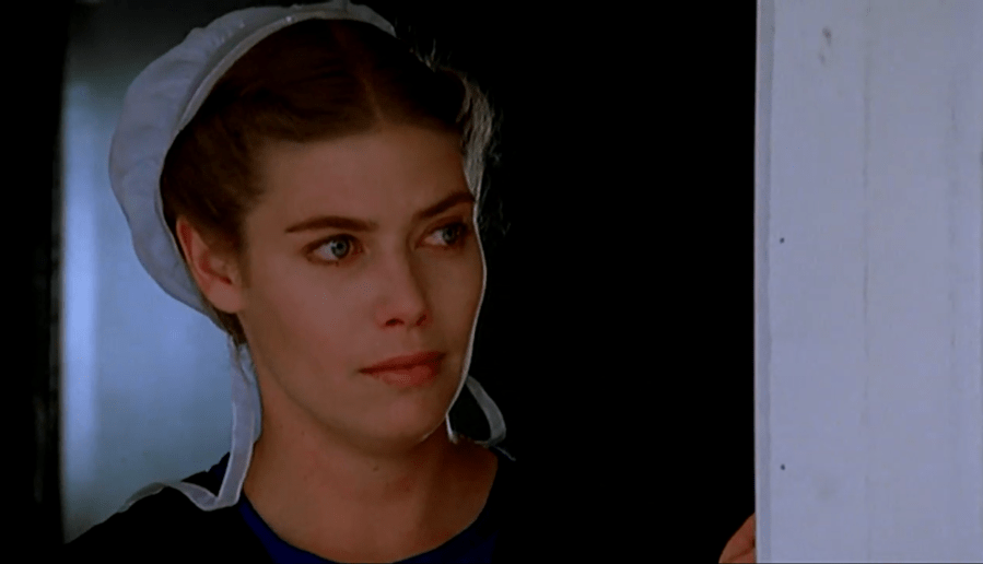 The year before Kelly McGillis played a nothing role in perhaps the most lunatic male fantasy of the 1980s, she plays the mother of a small boy, a wife who is only now a widow. The filmmakers found the simplicity in McGillis’s face in much the same way that they found the simplicity in the farmlands of Pennsylvania, and the results are similarly beautiful. This frame is from the end of Witness, around the time that Harrison Ford’s John Book is about to return to his precinct in Philadelphia. There is no character in Witness who has been on a greater emotional roller coaster than Rachel. Not Book, who has been disillusioned rapidly and completely about the ethics of his profession; not her son Samuel, who witnessed a man murdered in graphic detail in an Amtrak station bathroom and who has been hunted since. Rachel has had to worry for Samuel’s safety in the present and his wellbeing in the future, and almost as shuddering, she has had to face the person in herself who wants to commit some heavenly sins with John Book. Here, as she watches this man walk away, a man who is attracted to her too but could no more stay in Amish country than he could stay on one of the moons of Jupiter, and head toward the car she has sworn off as an Amish woman. There are other looks between the two, or involving the two, which probably stand out more to most people. After all, there is that one topless scene where she brazenly dares John Book to look up at her in her window. But this is something different, something chaste in its resignation. Her eyes are rimmed with red, her eyebrows are down, her mouth is firm. John Book in Philadelphia is the same as Jacob Lapp underground.