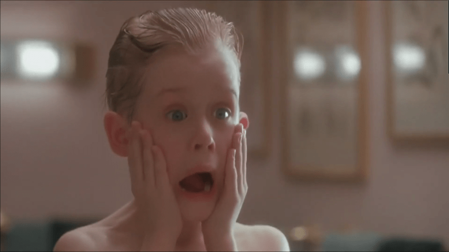 You know that line in “The Ladies Who Lunch” where Joanne sardonically muses, “Does anyone still wear a hat?” That’s basically how I feel about this joke, which I emphatically did not understand the first time I saw this movie and which I emphatically cannot relate to now. I’ve never used aftershave. Does anyone still use aftershave? Home Alone fits uneasily in that space between movies for adults and movies for children, and while it’s been a standard of the ABC Family/Freeform-style holiday playlist for going on three decades now, my most recent rewatch of the film makes me feel like it’s playing for adults more than it’s playing for children, making it a sort of upside-down Pixar movie. This scene where Kevin throws on the aftershave, unaware that it will burn when he does so, has become the iconic face from this movie, more so than Daniel Stern with the tarantula crawling on him, more so than Joe Pesci doing Joe Pesci things, more so than Catherine O’Hara being just shockingly normal down to her aversion to polka. The pull of Home Alone essentially boils down to “This is a cute kid, even if he’s actually sort of ugly,” and this is a cute kid moment for the adults who know better than this boy trying to accede to adulthood via grooming, grocery trips, and laundry.
