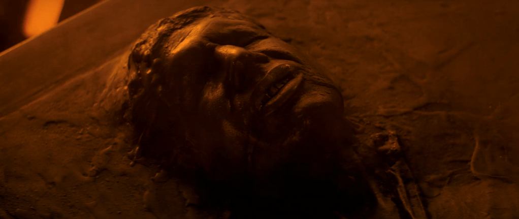 The Empire Strikes Back was easily my least favorite movie of the original Star Wars trilogy growing up. I loved the space battles, with all of the starfighters flying around and shooting at stuff; this one has some limited snowspeeder action in the early going, as well as the Millennium Falcon in the asteroid field, but nothing nearly as fun as a Death Star. Dagobah was so gloomy, and I cannot remember a time I didn’t know that Darth Vader was Luke’s father. (The greatest twist in movie history…totally lost on me.) And as a little person, I really did not like the idea that our heroes could lose. I did not like Luke losing his hand, or our other friends being betrayed and captured, and I did not like Han Solo frozen in carbonite. I’ve been seeing those teeth for so long…something about his teeth jutting out just did not sit well with me when I was four or five. And then there’s the rest of his face, his eyes closed but his eyebrows raised, the look of defeat which has crossed his mind and gone into his brow just as he was hardened into this carbonite prison. We’re given to understand that since Han has survived this process, he’ll be kept in a state of hibernation for some unknown quantity of time; only someone in some agony would sleep with such a face. This is the look of someone in a personal hell. Han Solo, the freewheeling smuggler who lives by his own rules, who might blunder his way into a situation but will then wriggle his way out, is all the way trapped now. In Star Wars, Han makes a comment about how he never expected he’d need to smuggle himself under the floor of his freighter. He’s met an exponentially worse fate here.