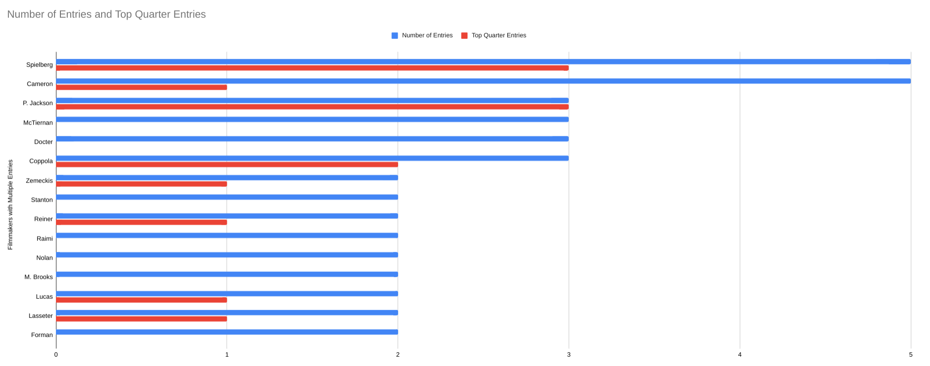 One of the first questions I had as I was working through my rubrics and compilations was a pretty simple one: Spielberg or Cameron? I’m a little alarmed by how conventional I am here, but I do think it’s tough to choose someone apart from the Phoenix dweeb and the angriest man in the history of Ontario. Who you choose as the greatest director of English-language blockbuster films in the past fifty years says something about more than just what kind of picture you want on the big screen while you guzzle down a Coke and swallow handfuls of popcorn whole. Choose Steven Spielberg and you choose, above all else, great focus. The shark, the hat and the whip, the T-rex, all of it presented with a hint of mystery first before striking you with the terrific reveal. James Cameron is not as interested in the reveal, or at least not so interested in us glimpsing a shadow before the whole figure. Cameron is about big, about playing with technological toys in the way that Spielberg is typically stereotyped doing. The melting body of the T-1000, the computer generated hull of the Titanic, basically all of Avatar. To answer this question based on my own rubric, I decided to look at it from two perspectives. First: who had more films in the top quartile of the list? And second: who was the more represented director?