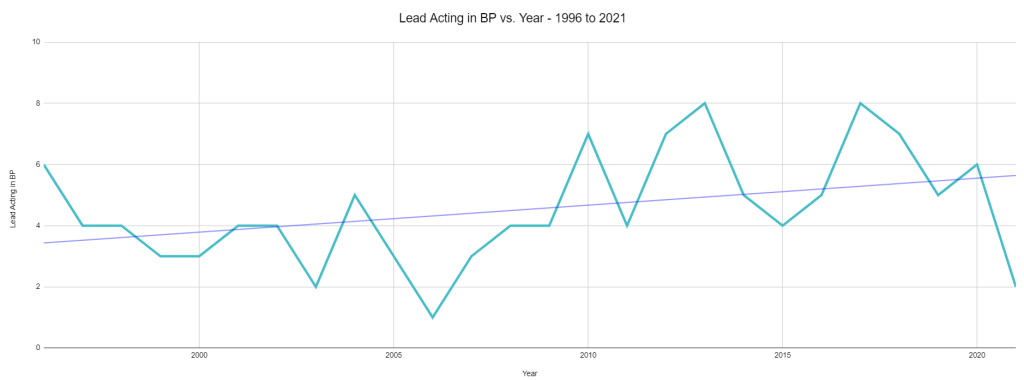As you’d expect, that’s a positive trendline; the more Best Picture nominees you have, the more likely it is you’ll have more Lead acting nominees among them. But that 2021 number stands out like a sore thumb, the lowest proportionally since 2006, when only Helen Mirren came from a Best Picture nominee and the other nine did not. This is a low number, though, and right now it’s a blip. I’d love to see how this number changes over the years, because right now it really seems like the other branches were just not on the same page as the actors, who overwhelmingly chose more performances based on real people. Four of the nominees in the Lead group are playing made up people: Benedict Cumberbatch, Denzel Washington, Olivia Colman, and Penelope Cruz. This feels like a relief because of how many acting movies are just biopics anymore, but given that the only one of that group who’s in a BP movie is Cumberbatch, that seems like the rest of the guilds are on a different page. Nightmare Alley, which scored three crafts nominations on top of Best Picture, feels like a rejoinder; so too does Dune, with its Best Picture nod and a host of meat and potatoes nominations. I don’t want to draw conclusions yet, as much as I’d like to, but…we’ll see!