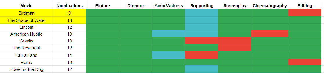 Last year, I put together a chart, which was basically needless at the moment and which is especially pointless now, explaining why Mank was not going to win Best Picture. The correlation between “most nominations” and “winning Best Picture” has been super weak in recent years. Since the 84th Academy Awards (for 2011 films), the movies with the most nominations were: Hugo (11), Lincoln (12), American Hustle and Gravity (10 each), Birdman and The Grand Budapest Hotel (9 each), The Revenant (12), La La Land (a record-tying 14), The Shape of Water (13), The Favourite and Roma (10 each), Joker (11), and Mank (10). Sharp-eyed readers will find only two Best Picture winners on that list. This isn’t to say that these films were unpopular, because I’d say about half of them were genuinely the front-runners for a significant stretch of their seasons: Lincoln, American Hustle or Gravity, The Revenant, Roma, and especially La La Land. But for the most-nominated winners, plus Power of the Dog, see if you can spot a pattern. Green means nominated once, teal means multiple nominations, and red means not nominated.