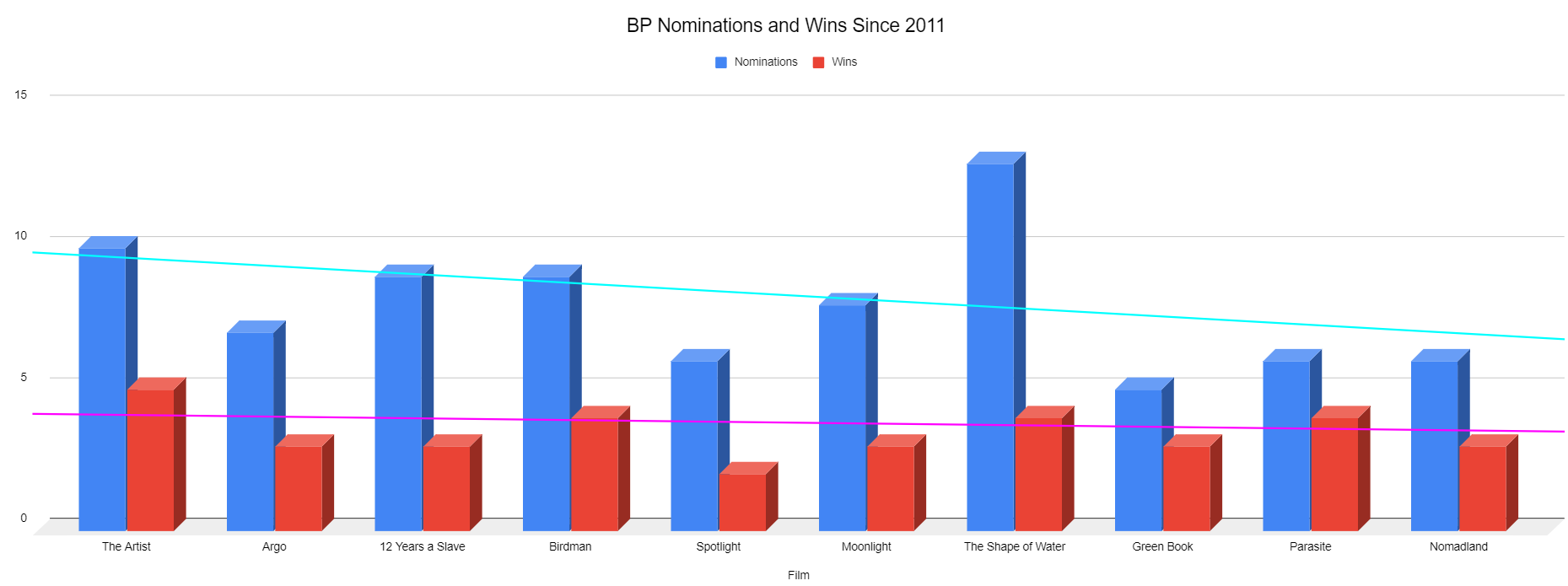 Since the great calamity of The Artist at the 84th Academy Awards, the number of Oscars the Best Picture winner walks away with has stayed fairly static, at about 3.5 per. However, the average number of nominations (about eight) is, historically speaking, a fairly low number. The most likely outcome remains, like I said, a 4-12 showing for The Power of the Dog. But the past few years tell us that a 3-7 result for Belfast is more in keeping with recent tradition.