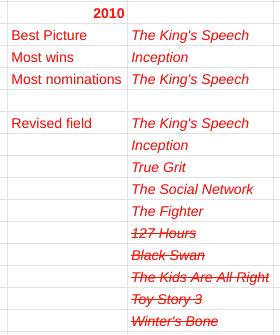 […] to nominate better movies than we’re doing for the biggest award. I’ve made this case in another post, but I have this sneaking suspicion that a five-picture field tends to do a better job of focusing […]