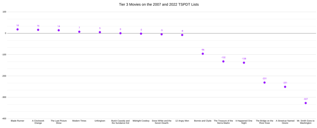 What makes these locks? To start with, all of them have been on both AFI lists. Almost all of them appear on both the BBC list and the THR list; all of them appear on Filmsite’s list. The vast majority of them appeared in the top third of the last list, and those that didn’t (Taxi Driver, Dr. Strangelove, North by Northwest, and so on) are, in this blogger’s opinion, pushed down because the directors of those films made movies higher up the list. To Kill a Mockingbird is 365th on TSPDT’s 2022 list, which makes it an outlier in this crowd. The Graduate and Schindler’s List are hanging out in the low 200s, but otherwise everything else in this group is within the top 15% or so of their most recent Top 1,000.