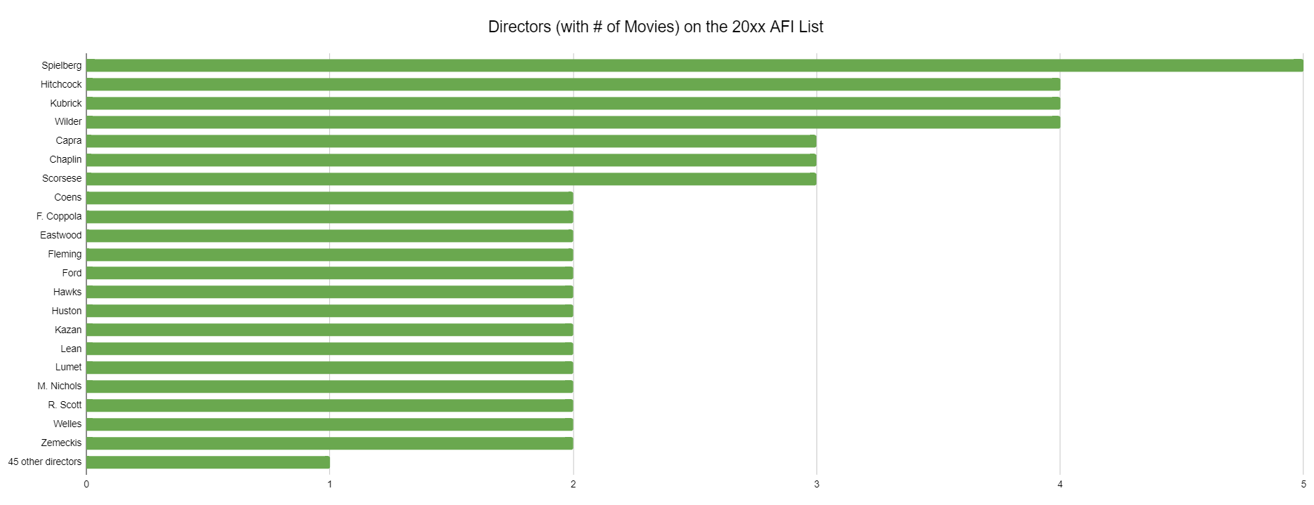 - On a similar note, Steven Spielberg has been the most represented director on both iterations of this list; he, as well as other historically meaningful directors (Martin Scorsese, Stanley Kubrick, Frank Capra, Billy Wilder, Charlie Chaplin, etc.) should have some number of films on the final list. On the other hand, major directors who defined the 1930s through the 1950s, such as John Ford, Howard Hawks, John Huston, George Cukor, William Wyler, and so on, should still be represented but maybe not as much.