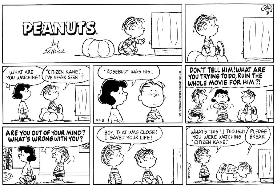 My first encounter with Citizen Kane was through Peanuts, which at first glance seems a little odd but on second glance seems pretty much right.