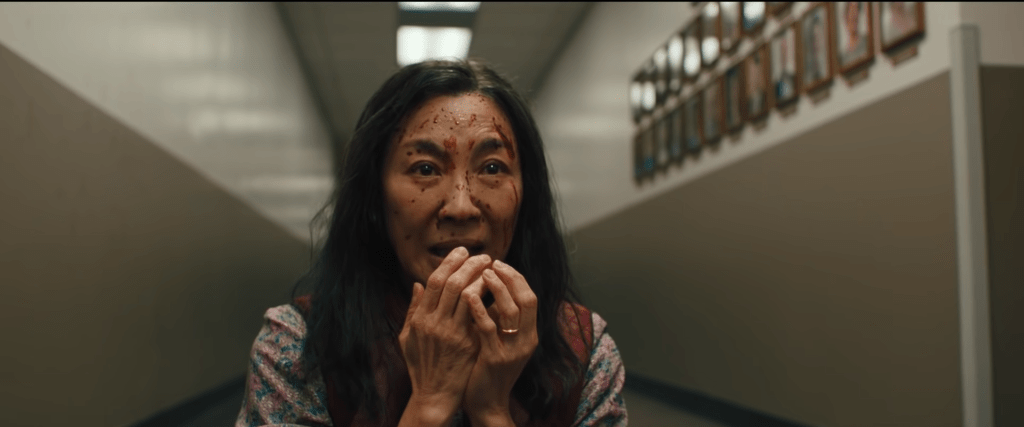 Richard Brody, as far as I’m concerned, buried this movie for good when he called it a “cynical feature-length directorial pitch for a Marvel movie.” It looks like a Marvel movie because it brings the same mid-brown sludge to action backgrounds (cut, I say cut that CGI budget). It looks like a Marvel movie because it uses a monocolor set (an all-white room here, the heavy gold theaters of Thor: Love and Thunder and Guardians of the Galaxy 2) to pretend that the movie is more colorful than it is. It looks like a Marvel movie because it chooses the mundane as the setting for great doings, with the IRS office standing in for the airport in Captain America: Civil War. It’s incredible that this bears repeating, but this is a visual medium. Not only does Everything Everywhere fail to do anything meaningfully different or new in its visual approach, nothing you haven’t seen done better in a Duran Duran video, but the visuals in this film are, at best, meh. When test pilots became astronauts in the 1960s, the differences in the laws of aeronautics versus the laws of orbital mechanics meant that they had to rewire their brains in order to fly spacecraft. A film with great visuals forces a moviegoer to fly a spacecraft rather than an airplane no matter how many hours s/he’s spent in props and jets. Everything Everywhere is an unattractive film, and there is no wonder to be found in its shots, either individual or sequenced. More importantly, it is the kind of film which one can follow visually even if the most challenging picture one has seen is based on comic book IP. If there are like, twenty-nine MCU movies and who even knows how many DC movies, and those movies are the most popular films of the last fifteen years, and Everything Everywhere just looks like another one of those, then it defies reason to suggest that this movie might be doing anything new with the way it looks.