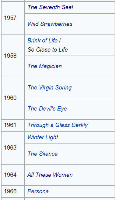 Eleven films, two of them absolutely revolutionary, all of them at least very good (we’ll get to All These Women), most of them transcendent. It’s a magical period, and there’s honestly as good a case to be made that the 1964-1973 decade is about as good as this one. (Some people prefer the Hour of the Wolf/Shame/The Passion of Anna loose trilogy to the Faith trilogy, and of course this gets you Cries and Whispers and Scenes from a Marriage to replace The Seventh Seal and Wild Strawberries. I know, tempting!) I’ve been thinking about this general idea for years, since 2017 when I was struggling/tripping over my own feet working through what the 100 best American movies might be. Who had the better 1970s: the aforementioned Francis Ford Coppola, who made four pictures that would get an A or better? Or was it Robert Altman, who made Nashville, a film better than any Coppola made that decade, plus twelve other movies that range from “meh” to “almost as good as Nashville.” It’s not as simple as just quantity versus quality. because otherwise people like George B. Seitz would need to be involved in these kind of debates. It’s more like a pitcher who can throw 150 innings in a year with incredible rate stats as opposed to 215 with weaker rate stats; a lot of analysts would tell you to pick the guy who can give you forty percent more innings.