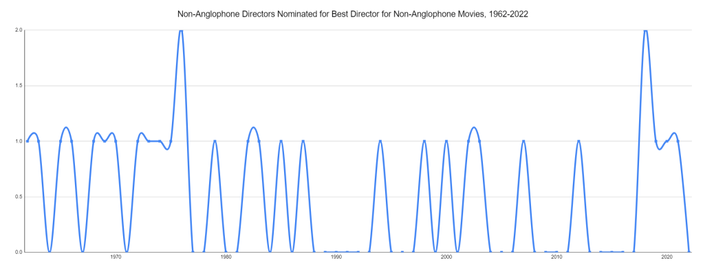 In the past few years, the internationalization of AMPAS has probably been most notable in the nominations for Director. Here’s a chart that I didn’t really want to make but didn’t feel like I could not make, y’know?