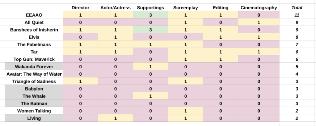 So this is every movie that’s got multiple nominations. Movies with a gray background are not Best Picture nominees. If you think Everything Everywhere has a good shot to win Best Picture, and of course you do, you have to reckon with the fact that Banshees of Inisherin has the exact same number of above the line/predictive nominations as Everything Everywhere. (The two categories where Everything Everywhere got up to eleven: Original Song and Costume Design. Not backbreakers!) The Letterboxd normies surely like that Everything Everywhere has that A24 stamp on it, like Moonlight did, but it’s worth pointing out that The Banshees of Inisherin is a Searchlight movie, and they’ve picked up two Best Picture winners since that first and only win for A24 back in 2016. A24 is the film studio with the most total nominations; do they have the resources to do a full-court press for all of them? I also think that there’s room for a really compelling narrative about Martin McDonagh, who made the incredibly polarizing (and, incidentally, quite bad) Three Billboards Outside Ebbing, Missouri. McDonagh’s gone home to Ireland! He’s made this actor-forward film about broken friendship! There are donkeys! It’s easier to like The Banshees of Inisherin, and I think the redemption arc writes itself if you’re in PR for Searchlight and you’re trying to make your FYCs stand out. With all that said, I don’t even know what to make of its chances in Original Screenplay, which is the loaded half of that category.