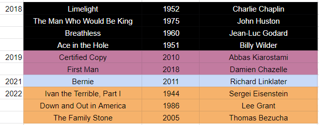 January 27th honks! In 2018, I spent a Saturday on Filmstruck; in 2022, I had a busy afternoon on the Criterion Channel. All of these were first watches for me except for Bernie, which I was going to show for a movie club at school later in the week, and I love first watches more than I love any other kind. I am excited to watch a movie I’ve never seen before. What if it has an idea I’ve never encountered previously, a shot or an expression I’ve never come across? What if it’s one of the best movies of its year, of its decade, or one of the best by its director or with its star or from one of its technicians? I saw Ordet for the first time in March of 2017, and it was the best movie I had ever seen. It is still the best movie I’ve ever seen, but I haven’t given up hope that there may be a greater movie out there somewhere. If the most important feature ever made is Battleship Potemkin, and Citizen Kane is second, then Breathless is probably third. It’s so wonderful to think that a person can sit down on the couch and decide, Hey, I guess today is the day I see the third-most important movie of all time, one that’s been rewriting editing for more than six decades now. Or that on a Sunday, you can pop in a movie you got from the library and find out that it was the best movie of the 2010s, maybe the best movie of the century. Certified Copy is this narratively complex film, complex with its own story but also pulling knowingly from Journey to Italy and literary theory. I adore it for that complexity, but also for the unbearably true simplicity at its center, this idea that Juliette Binoche speaks while she curls on top of the sheets. “If we were a bit more tolerant of each other’s weaknesses, we’d be less alone.” On January 27th, you can have your heart broken hearing something so permanent. And on January 27th, you can also be unlucky enough to watch The Family Stone, a movie which just sucks. The high of seeing Eisenstein’s masterful Ivan the Terrible, Lee Grant at her broadest and yet most terrible focus…and then The Family Stone, a movie that is so offensive and awful that I honestly don’t even have words for it. Life’s funny like that. (Unlike The Family Stone, which is devoid of humor, unless you think that the way God made horseshoe bats or star-nosed moles look has a mirthful malice to it.)