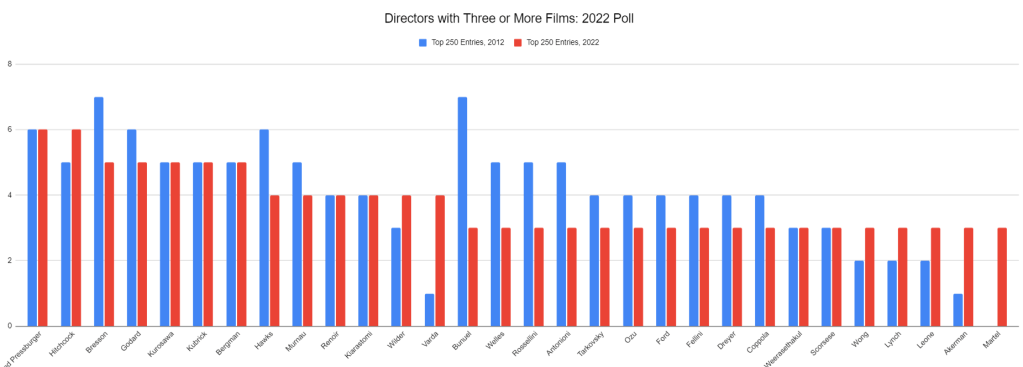 Forty-eight movies tied with seven votes for representation in the top 250 of the 2012 list. Two-thirds of them did not make the 2022 list, which was certainly foreseeable. The Piano was the only film to make the top 100 from that position, although The House Is Black came pretty close. All That Heaven Allows and Where Is the Friend’s House? both made nice jumps too, but these are absolutely the exceptions. Most of those movies from the tied-235 section are gone, even movies by Sight and Sound luminaries like Hawks, Visconti, Weerasethakul, and Satyajit Ray. The chart above is the list of directors who made the top 250 in 2012, most of them in that danger zone at tied-235, and how many movies they had before they were knocked out.
