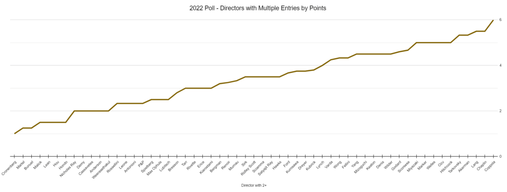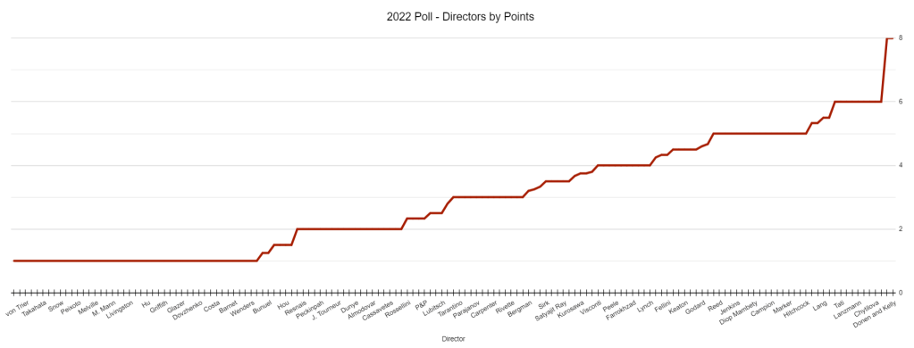 So the person who made me think about this is Pedro Almodovar, who definitely does have a movie on this list. All About My Mother, as it has been since 2002, is named in the poll, although where it’s been in the poll has fluctuated since 2002. I am continually surprised that we can’t get a second or even a third Almodovar on this list, but at least there’s one! There are 151 other directors/director pairs on this list besides Almodovar with at least one film. (If I can editorialize, here are some other directors where I think it’s wild they only have one film listed, in alphabetical order: Robert Altman, Sergei Eisenstein, Jean-Pierre Melville, Sergei Parajanov, Jacques Tati, Tsai Ming-liang, Luchino Visconti.) That means that the average director on this list comes in with 1.73 films per, which seems about right to me?