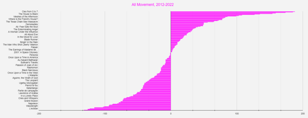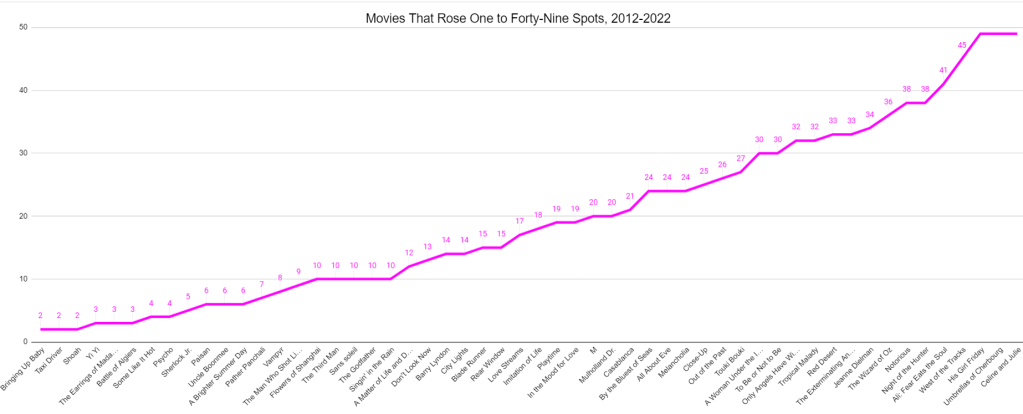 In the spirit of the thing, I have a series of charts here that show: films that rose fifty or more places from 2012 to 2022, films that rose between one and forty-nine places, films that dropped one to forty places, and films that dropped more than forty places. The only movie that doesn’t appear on any of those charts is 2001: A Space Odyssey, which is still hanging on to sixth.