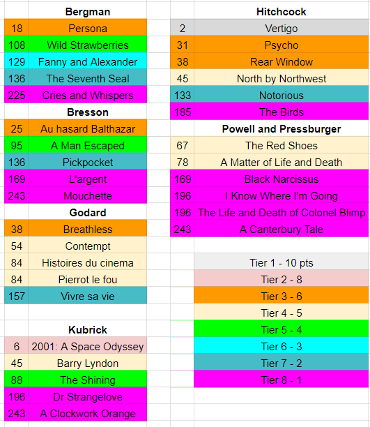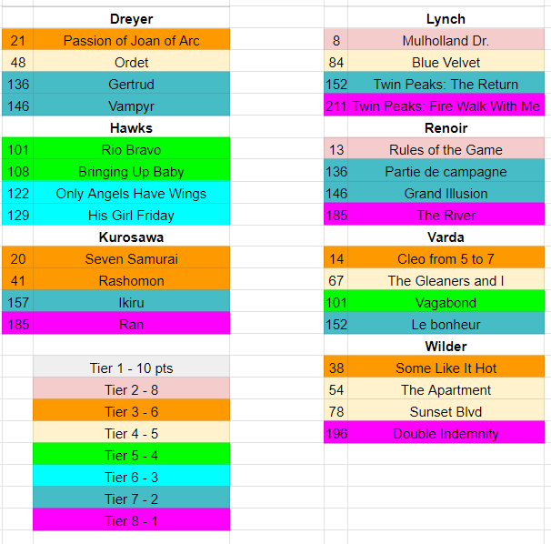 I figured I knew the answer to this already, but I checked anyway. I looked for all directors with at least three films entered and then compared how many tiers their films were in. I’ve got Hawks across two tiers; was there anyone else who was personally sabotaged by making enough movies of roughly similar quality that voters couldn’t decide?