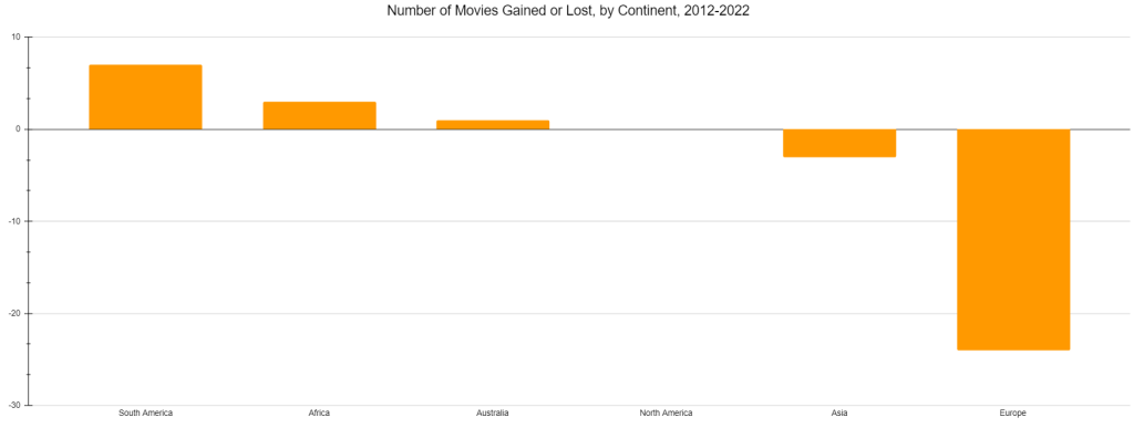 Asia netted negative three films from 2012 to 2022, which I thought was pretty surprising! First off, I wanted to start by charting all nations with a film in the top 250 in 2022.