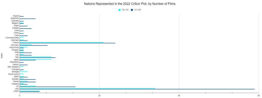 Europe netted a loss of twenty-four films from 2012 to 2022. Forty-eight European films were lost, and twenty-four were added. Forty-six of the movies lost were directed solely by men. Two of them with coincidentally Italian names, The Turin Horse and Sicilia!, were co-directed by women. As for the new films, half of them were directed by women, although there’s not much variety in them either geographically or personally. Eight of them are French (and one is Belgian). Two of them are British, leaving a single Soviet film. Over half are by Chantal Akerman, Celine Sciamma, or Agnes Varda, and I think that’s where the difference lies. It’s not that like there’s some enormous diversity in the people who have come in on the European side, and if you looked at this and said “People put in Vardas and Akermans instead of Kieslowskis and Hanekes this time,” that would be true on the aggregate if not necessarily on a ballot to ballot basis.