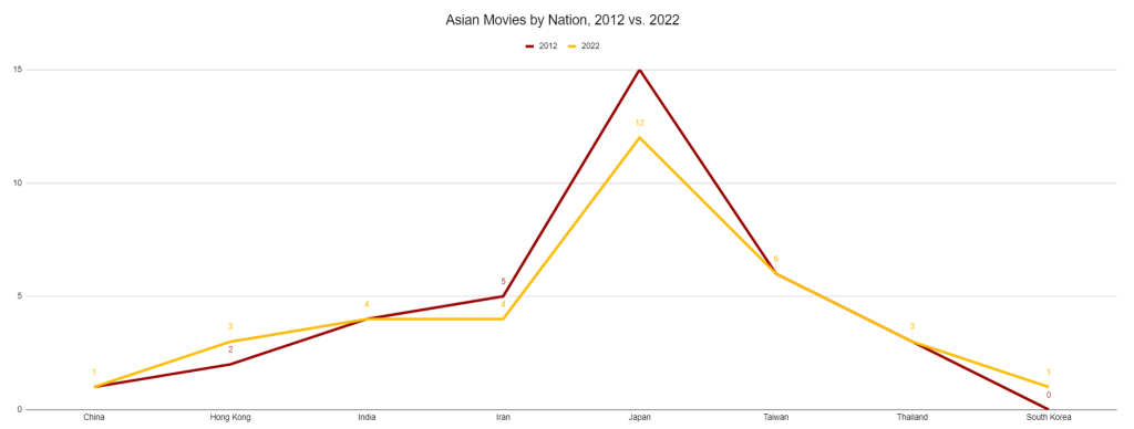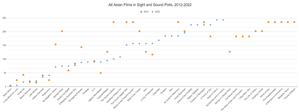 And this next one shows every Asian movie that was on the 2012 or 2022 list, and showing what number they rated at in 2012 and 2022.