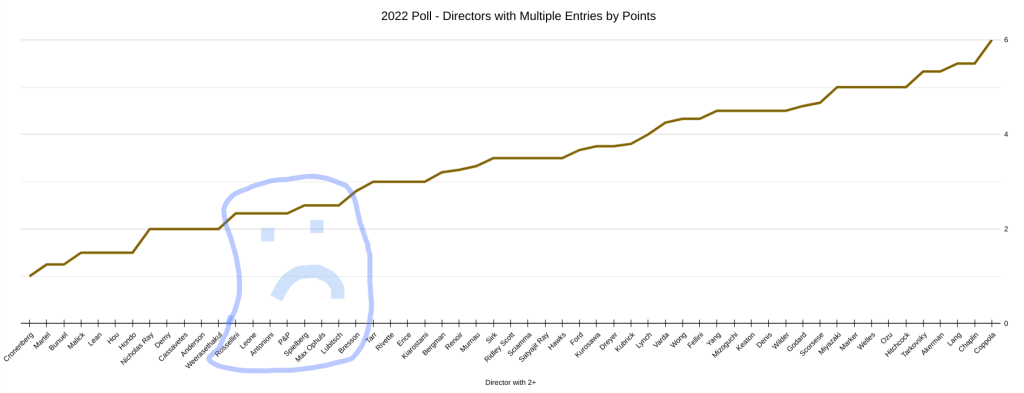 Maybe Steven Spielberg doesn’t really belong in this group, seeing as Jaws came in just outside the top 100 despite being completely absent from the 2012 list. (I know, something else to talk about later.) On the other hand, the guy did just lose E.T. from his count, and here I thought that was going to be one of his more reliable numbers. I’ll also listen to objections about Sergio Leone, who has Once Upon a Time in the West in the top 100 and got The Good, the Bad, and the Ugly on here as well. But the rest of the men here are in some kind of peril. They, and here I do include Spielberg and even Leone, who has now split from halves to thirds, bear filmographies which are just varied enough to deny a consensus. One may pick and choose just a little too much from these. Take Bresson, who in the past two polls has seen Au hasard Balthazar, Pickpocket, A Man Escaped, L’argent, Mouchette, Diary of a Country Priest, and The Devil Probably make the cut. He’s down to the first five now, with only Balthazar and A Man Escaped in the top 100, and the latter barely hanging on at that. Taxi Driver is Pickpocket now, and I say that ruefully despite being someone who prefers Taxi Driver. Antonioni has three features on the list, having lost The Passenger and Blow Up from 2012, and L’eclisse is one of eight movies on the 2022 list to have fallen more than one hundred spots. The others? Silent movies (Intolerance, Greed, The Last Laugh), a Bresson (Mouchette), the increasingly radioactive Woody Allen (Annie Hall), and two by Powell and Pressburger. A Canterbury Tale is not going to be here in 2032, and despite the lake still being there and Candy, presumably, remaining unchanged, I worry that we’ll lose Colonel Blimp as well. The Archers combine for six films, a number that is equaled only by Alfred Hitchcock on this poll. But despite being tied for first in films, they are tied for fifteenth in points, alongside Bresson(!), Scorsese, and Howard Hawks. I’ve lamented the loss of older films in that post I linked to up there, and trust me, that dissatisfaction spreads out to losing multiple Mizoguchis and Spring in a Small Town as well as losing Bresson and watching silent cinema disappear. I won’t reiterate the bulk of that again; mostly I don’t like the feeling that the people who I’d hope would have longer views don’t really seem to maintain that kind of vision.