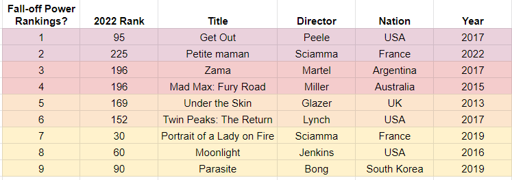 I started by pulling all titles new to the 2022 list, and then I decided to keep it to movies which were released from 2012 on. As much as I’d love to talk about why Heat is proof that there are way too many Gen Xers in this voting pool, I don’t want to try to predict which movies from the 1990s or 2000s aren’t going to make a list in 2032. Then I decided to power rank which movies I thought were most likely to drop from the 2032 list after a single appearance here. This is mostly vibes, stop yelling at me.