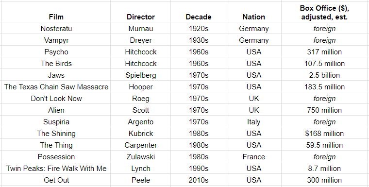 There are two things most interesting to me in the films which qualify most as horror (as opposed to like, Videodrome, which I’d prefer to call science-fiction). First, that they are overwhelmingly from the 1970s and 1980s. Second, that a number of them are historic American box office successes, especially against their budgets. Take a look.