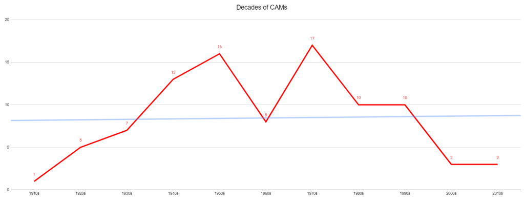 The average canonized American movie (CAMs) was released in 1965, and the trend ever so slightly points to newer movies at the expense of older. The 1970s are America’s great cinematic years; the 1950s are pretty close. The 1910s are imperiled.