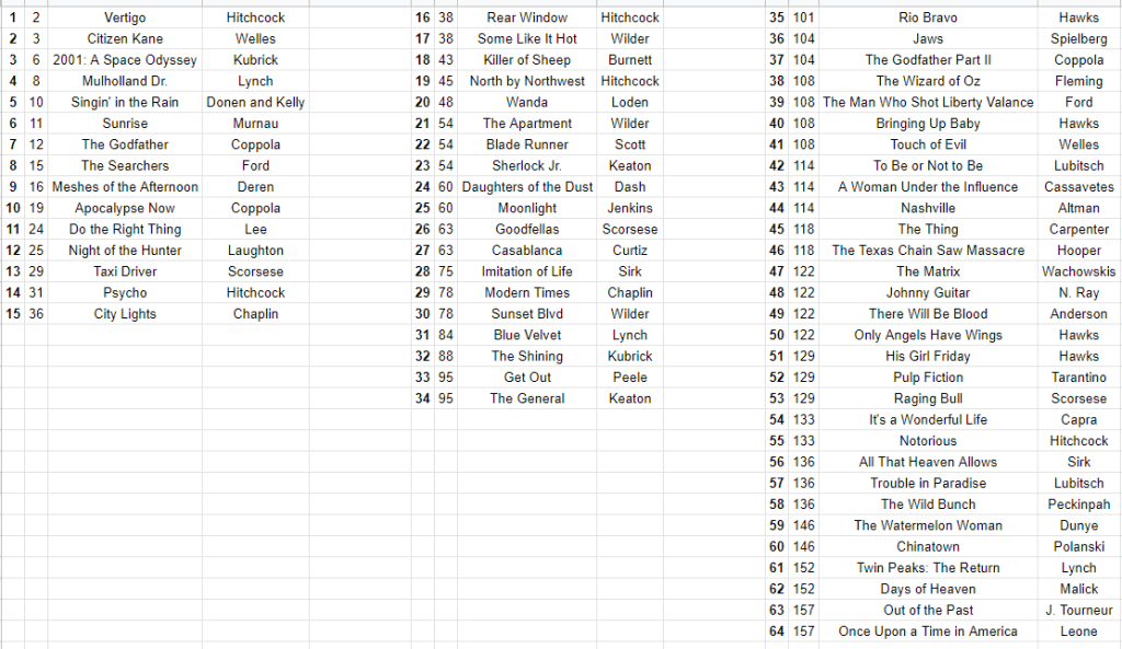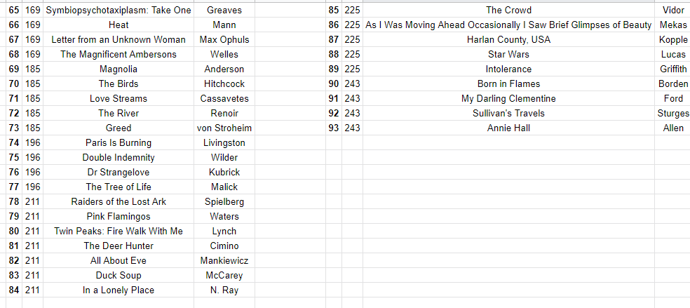 The story of that poll was Vertigo, mostly because it was the first time that a non-Citizen Kane film had topped the list in some decades, but I think it’s also worth pointing out that Vertigo was on 22.5% of the returned ballots. 846 people voted, and 191 of them had Vertigo as a top-10 movie all time. That’s an absolutely incredible ratio. The flip side is that to make the top 100 (technically the top 101) in 2012, a movie needed seventeen votes from 846 ballots. That’s 2%, like the milk. Getting seventeen people from that voting body to say your film is one of the ten greatest of all time is obviously no small feat, but to be named on the 2012 poll’s Top 250, a movie needed seven votes. Still a great accomplishment, and yet that’s less than one percent of all ballots. We don’t have the numbers for the 2022 poll yet, but even with about twice as many voters I’d be surprised if the pattern weren’t similar to this. At any rate, that’s why I think a top 25 spot is incredibly impressive and a spot around 80 is really not all that different from a spot around 175.