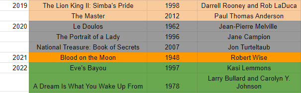 I keep not watching movies on days that were just profoundly weird for me in the past, and I must have been on something in 2019 when I rewatched not one but two movies in a single day. (In fairness, that was the viewing of The Master where I first started coming around on it as not just a great movie, but like…a Great Movie.) It’s been a varied day for me, with a number of movies I’ve really enjoyed. Any Melville is a friend of mine, and for someone who for better or worse was raised on Tarantino, watching Le Doulos was what really solidified my opinion that Tarantino’s best ideas largely came from someone not named “Quentin Tarantino.” Blood on the Moon, my favorite first watch of February 2021, we’ll come back to. Eve’s Bayou has become one of those reclaimed ’90s movies that we’ve all rediscovered first through someone else’s podcast and then through streaming, and I was glad to have been part of that rediscovery process. The ideas are bolder than they are polished, though Debbi Morgan’s performance, for people who are happy to watch a movie for such a great performance, is one I cherish knowing. Without her incredible romantic strangeness, I’m not sure this would be a movie worth all the reclamation.