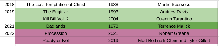 At least it was a good day for rewatches historically? Maybe Last Temptation, The Fugitive, and Badlands don’t make for the neatest triple feature in the world, but there are not many cinematic itches I need to scratch that those three can’t get their fingernails on. The other three films here are all a little underwhelming for me. My disinterest in Robert Green’s method of documentary filmmaking may well force me to give up my leftist movie-watching card. Ready or Not we’re going to come back to pretty soon, because it’s part of a subgenre that I’ve got virtually no patience for. And then there’s Kill Bill: Vol. 2, which I definitely prefer to the first iteration. As he’s gotten older, Tarantino’s interest in depicting those vignettes which guaranteed his fame has faded, and instead he’s gotten more and more interested in telling them. Reservoir Dogs turns on the commode story, but of course there’s no original referent outside of the script that Tim Roth’s character has to put to memory. It’s clever. Pulp Fiction provides the vignettes, and when it doesn’t, at least it has Christopher Walken there to do one of the more memorable line readings about rectal timepieces we’ve ever come across. Inglourious Basterds does the vignettes, and then after that…it’s kind of a wash. The Hateful Eight is bad no matter how you slice it, and one of the most important reasons that movie is so weak, second only to Tarantino’s sudden fascination with writing predictable jump scares, is because the film would much rather say the vignettes than perform them. Show, don’t tell, and all that. Kill Bill: Vol. 2, for all of the anticlimax which that film indulges in, at least believes in showing us the vignettes. The self-aggrandizing pseudomythology of Vol. 1 gets old fast. The individual sequences of training, being buried alive and then being unburied, they stick so much more than anything else in either of these two movies.