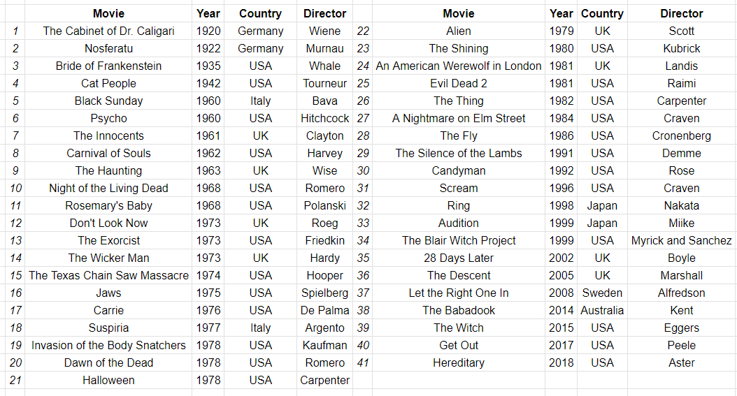 Back to our canon. Average year of release 1977, and with the exception of the ’50s (shut out!), at least two movies from every decade from the ’20s to the ’10s. The 1970s are represented with eleven movies, and no other decade has more than seven. These movies come from just seven countries, and this group is seriously Anglophone. A number of past and present luminaries in the genre are represented: Italy’s Dario Argento and Mario Bava, visiting professors like Steven Spielberg and Stanley Kubrick, new voices in Jordan Peele and Ari Aster, real freaks like James Whale and David Cronenberg. And three men, perhaps even the three you’re imagining, each rate two movies and thus make up one-seventh of this list on their own: George A. Romero, John Carpenter, and Wes Craven. Canons are predictable creatures, and this one is no different.