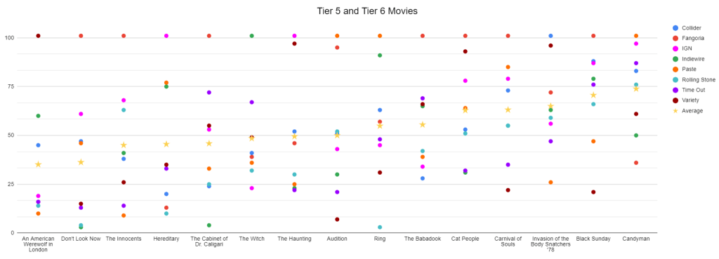 Here’s the same chart, but for every movie which appears on seven lists. If a movie doesn’t appear on a list, I entered a rating of 101. Tier 5 contains six films, all of which have three top twenty-five mentions: An American Werewolf in London, Don’t Look Now, The Innocents, Hereditary, The Cabinet of Dr. Caligari, and The Haunting. Tier 6 contains all other movies with seven placements.