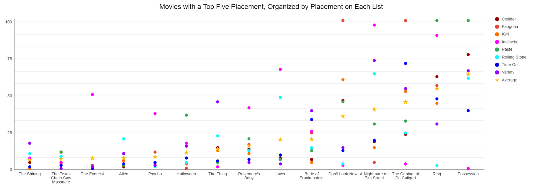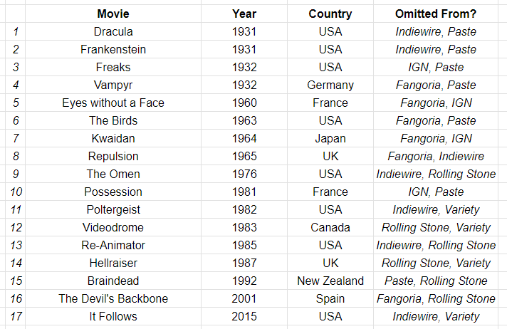 Recently, I was inspired by the unveiling of the Variety list of the 100 best horror movies. I was curious why the list had been received with trepidation. To sum up the post, my conclusion was that Variety included a number of older movies which rely more on atmosphere than gore or jump scares, and that in making that choice, the list peeved people who were expecting more recent, “scarier” entries. I think I made some decent points about the Variety list in that post, but it felt a little small in scale to me almost as soon as I published it. So I went spelunking for more top 100 lists, and found five more. I was already using the Fangoria readers’ list and the Time Out top 100. I’ve since added top 100 lists from Collider, IGN, Indiewire, Paste, and Rolling Stone. It’s still not a huge sample, but I feel better about working from these seven critics’ list and one readers’ list than I felt working from three total.