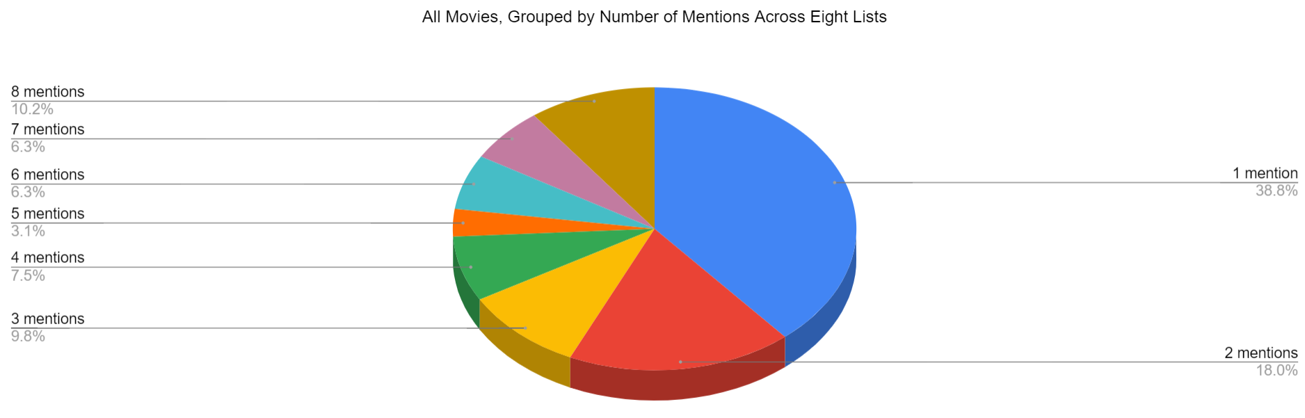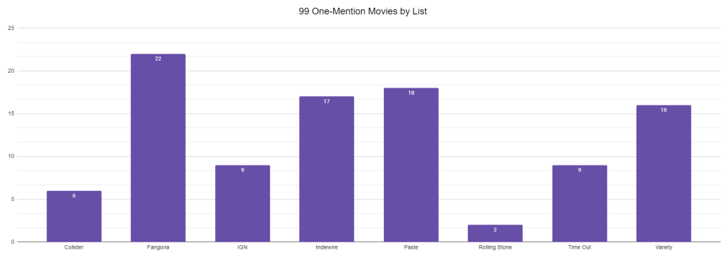 If you don’t count The Abominable Dr. Phibes popping in at #101 on the Rolling Stone list (sorry, Kumail), we have 800 potential movies to work from. It’s unrealistic to expect 800 different movies, obviously, and it’s probably unrealistic to expect even 350 different movies. In total, there are 255 movies listed at least once across all eight lists. 154 of them are named on at least two lists.