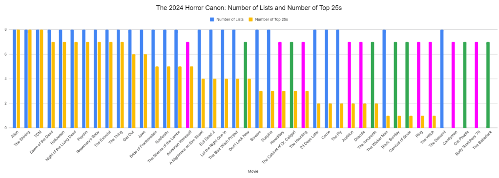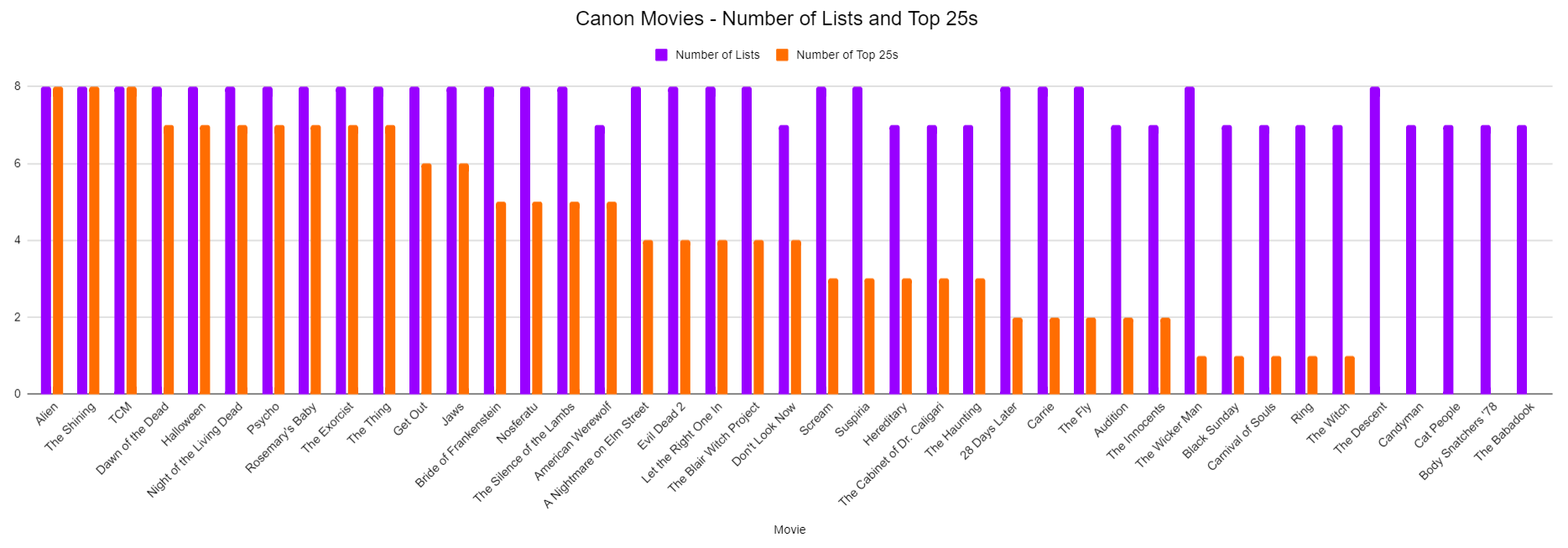 I’ve broken down the canonical movies by how many lists they appear on within the top twenty-five.