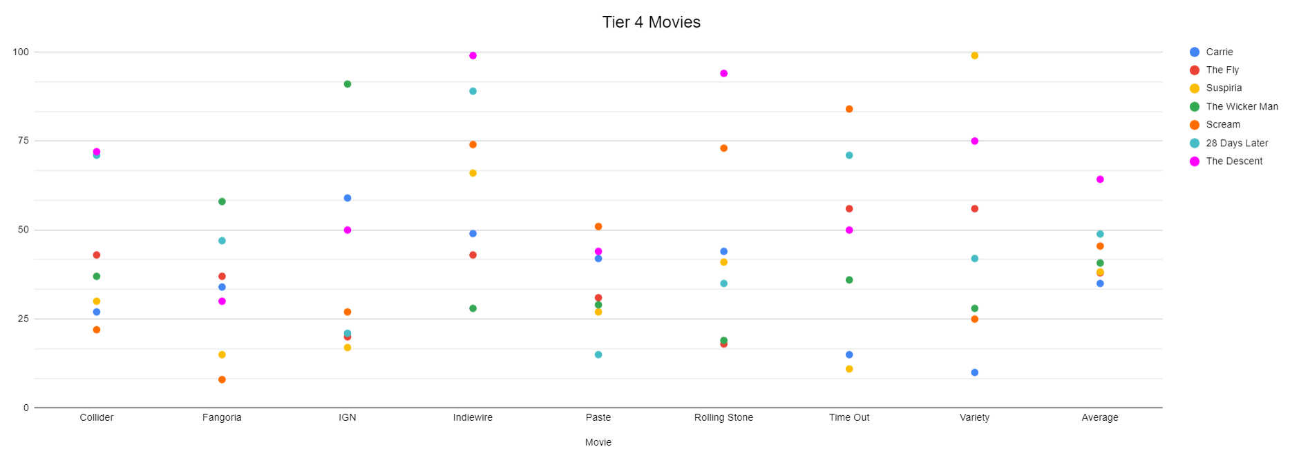 I like that it’s easy to see what each list makes of these Tier 4 movies. Paste is high on them, as a general rule, and so are Collider and Fangoria. Indiewire not so much. I also think it’s neat that the averages for these other movies are so tight. Six of these seven movies are, on an average list, within fourteen spots of one another. The Fly averages 38 even. Suspiria averages 38.25. With one exception, there’s a tacit agreement between our lists about what kind of movie deserves to be on each list but deserves to be near the top but rarely. We keep them between the 35th and 50th percentiles. They’re safely, if not riotously, included in these lists.