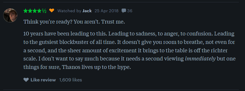 I went into the Letterboxd reviews for this one, because when I look at Infinity War, I see it as one of the last moving boxes you pack up. You have all this stuff that didn’t make it into other boxes, but this has to come with you to the new place. Some of it might even be important, meaningful stuff that you couldn’t actually put in a box you packed up earlier because you still needed it. This final box is above else full, and full almost at random, impossible to unpack efficiently. There are other people who look at Infinity War and see the Grand Canyon. I’ve screenshotted a couple, but I want to link to this review, which I think speaks to the enthusiasm people feel for this movie, and this other review, which has a fascinating first paragraph and a very, very amusing final one. Anyway, screenshots.