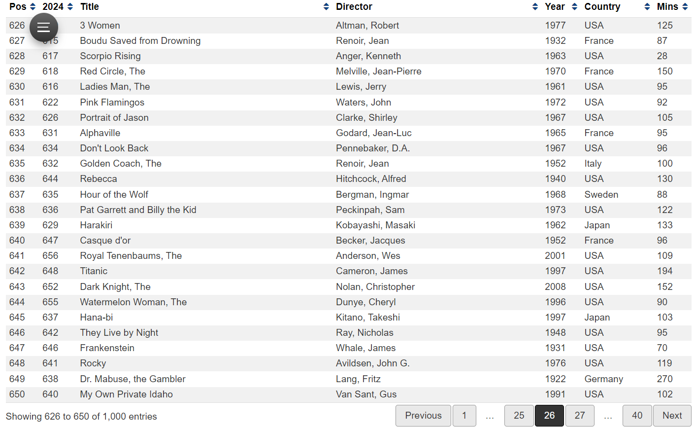 This is the twenty-sixth page of the most recent They Shoot Pictures, Don’t They? Top 1,000. TSPDT is utterly comprehensive, using thousands of data points, not simply from lay viewers but from people with critical backgrounds. There is no resource that I trust more to lay out which movies rate “higher” or “lower.” In my last post, I used the most recent Sight and Sound ballots to make this point, but since I published that one, TSPDT has updated, and I think this makes two very important points. Firstly. The Dark Knight is ranked as their 643rd best movie, based on all of the mountains of information they use, out of a starting list of more than 25,000 movies. That puts The Dark Knight in the top 2.5% of their data set. That’s a phenomenal accomplishment. Look at the movies around it: Rebecca, Frankenstein, fellow Letterboxd favorite Harakiri. From the perspective of scale, it’s amazing that The Dark Knight is received so favorably. Secondly. The Godfather is sixth, Part II is thirty-third, and Part III is 999th. Critically speaking, The Dark Knight is closer to Part III than it is either of the first two Godfather movies.